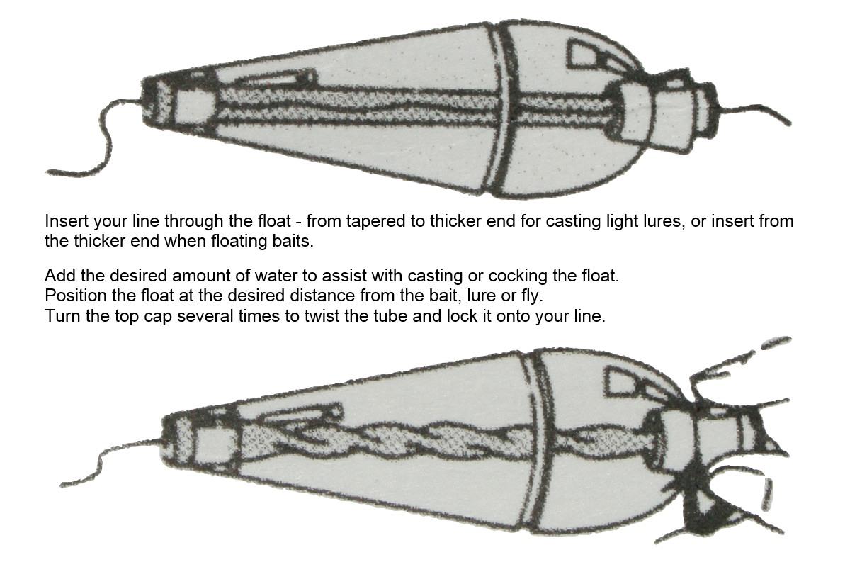 Rig with the narrower end of the float toward the rod tip when retrieving lures and flies, or rig with the wider end of the float toward the rod tip when suspending baits.