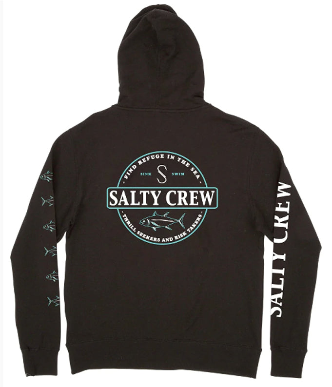 The Deep Sea Zip Fleece in Black is a men's zip-up midweight hooded fleece with kangaroo pouch pocket and draw cord hood. Featuring custom Salty Crew screen printed graphics on the front, back, and sleeves. Made from 80% cotton and 20% polyester.