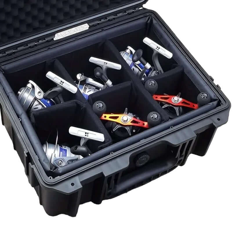 This fishing reel storage system is designed for durability and ideal for safeguarding your reels during travel. Its velcro dividers can be adjusted to accommodate most reels, while the waterproof and heavy duty construction ensures top-grade protection.