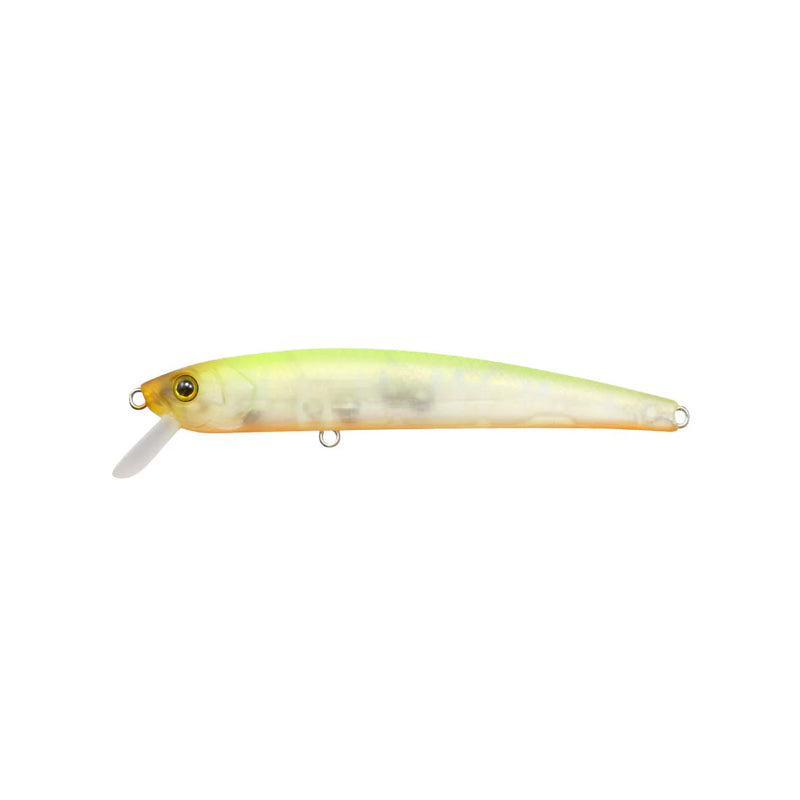 The Issei minnow jerk bait that gets the fish to bite with random darts. A mid-size (89mm) jerkbait next to the GC Minnow. This minnow, which differs not only in its action but also in its basic concept, was accidentally born from a "poorly made minnow." The air chamber volume is concentrated at the front, giving it an unstable balance, and when jerked or twitched, the internal weight moves back and forth randomly, causing it to lose balance in the water and creating the appearance of a dying small fish.
