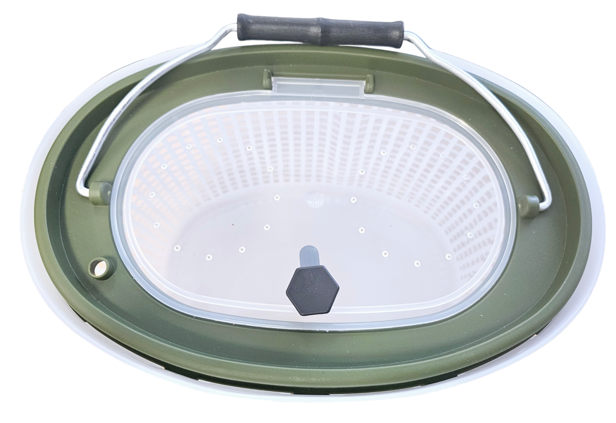 The Oceanstream bait bucket with hatch on lid to allow easy access to bait, Removable inner plastic mesh bucket to allow for quick and easy water changes. Perfect for live baits, cockles or even keeping your catch fresh. The basket lifts out of the bucket allowing you easily fill your bucket with fresh water to keep your bait alive.