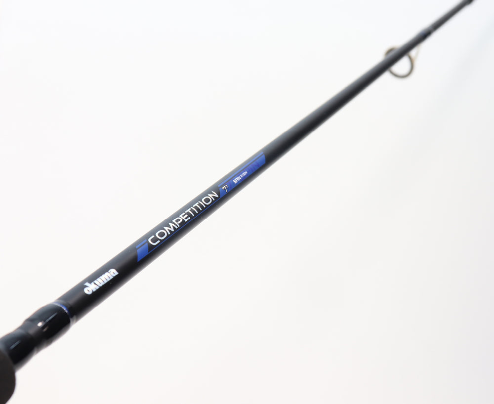 Okuma Competition rods feature graphite composite rod blank construction, stainless steel hooded reel seat with Okuma logo, split grip butt design for reduced weight and improved balance.