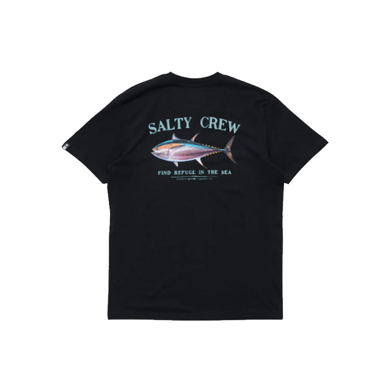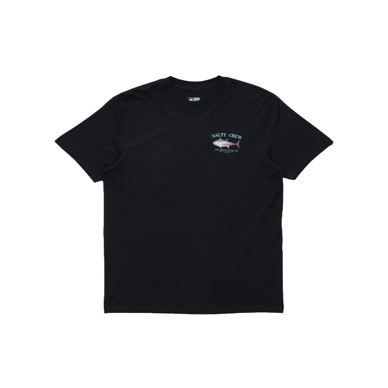 The Salty Crew Big Blue Premium SS Tee in Black is made from 160gsm ring-spun cotton jersey for soft, durable comfort. It features digital prints on front and back and a Salty Crew clamp label at the sleeve hem.