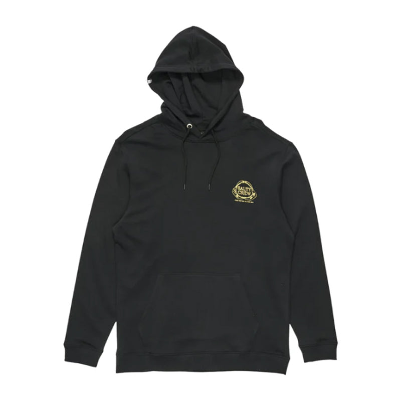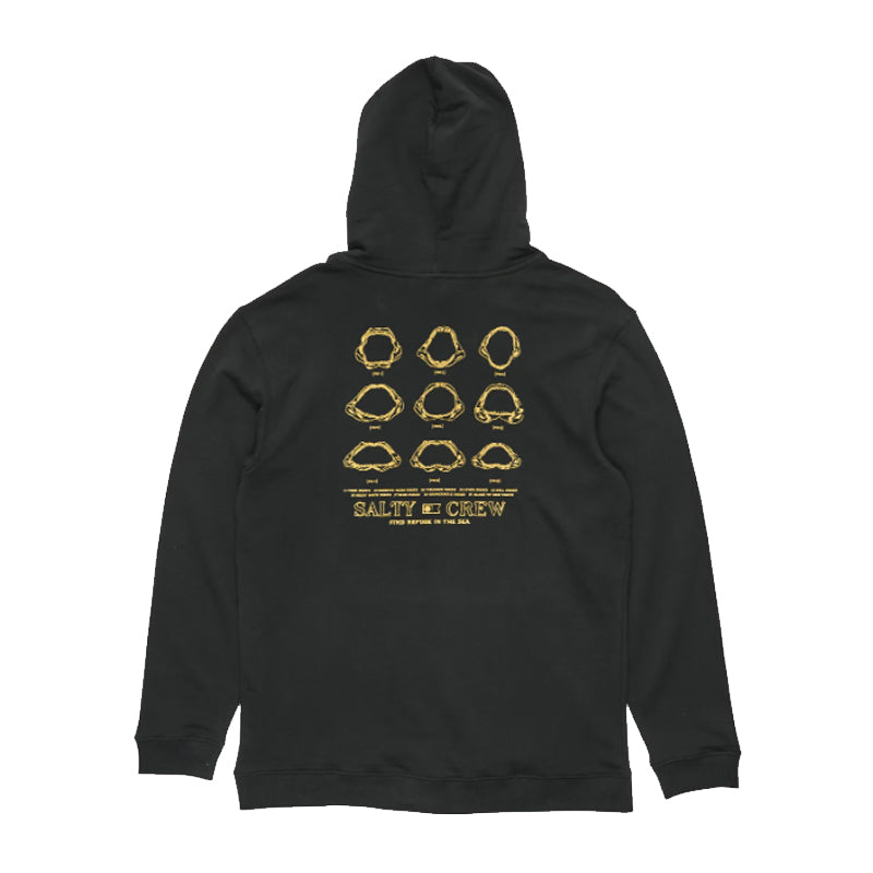The Jawbone Midweight Fleece Hood in Black is made from our signature mid-weight Cotton/Polyester Brushed Fleece, 300gsm in weight. Featuring a two-piece hood with encased drawcord, rib knit cuffs and hem, self-fabric kangaroo pocket, and Salty Crew clamp label at the hood opening. Finished with screen printed front and back prints.