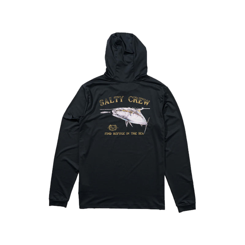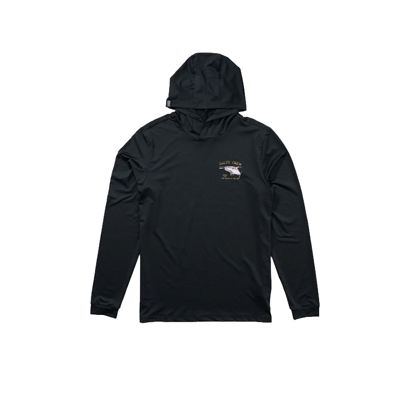 The Surface Hooded Sun shirt in Navy is a long sleeve sun shirt made from recycled polyester/elastane 4-way stretch fabric. It features set-in sleeves and a three-piece hood with a snap button closure, offering anti-microbial properties, UPF50+ sun protection, and sweat-wicking capabilities. The sun shirt showcases digital-printed designs on the front and back.