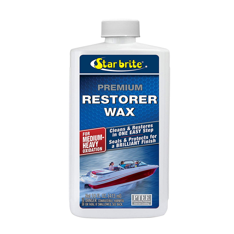 Star Brite premium restorer wax enhances shine while adding protection against stains and UV exposure. Ideal for use on coloured fibre glass hulls. Removes medium to heavy oxidation. It can be applied by hand or with a buffer. 473 ml.