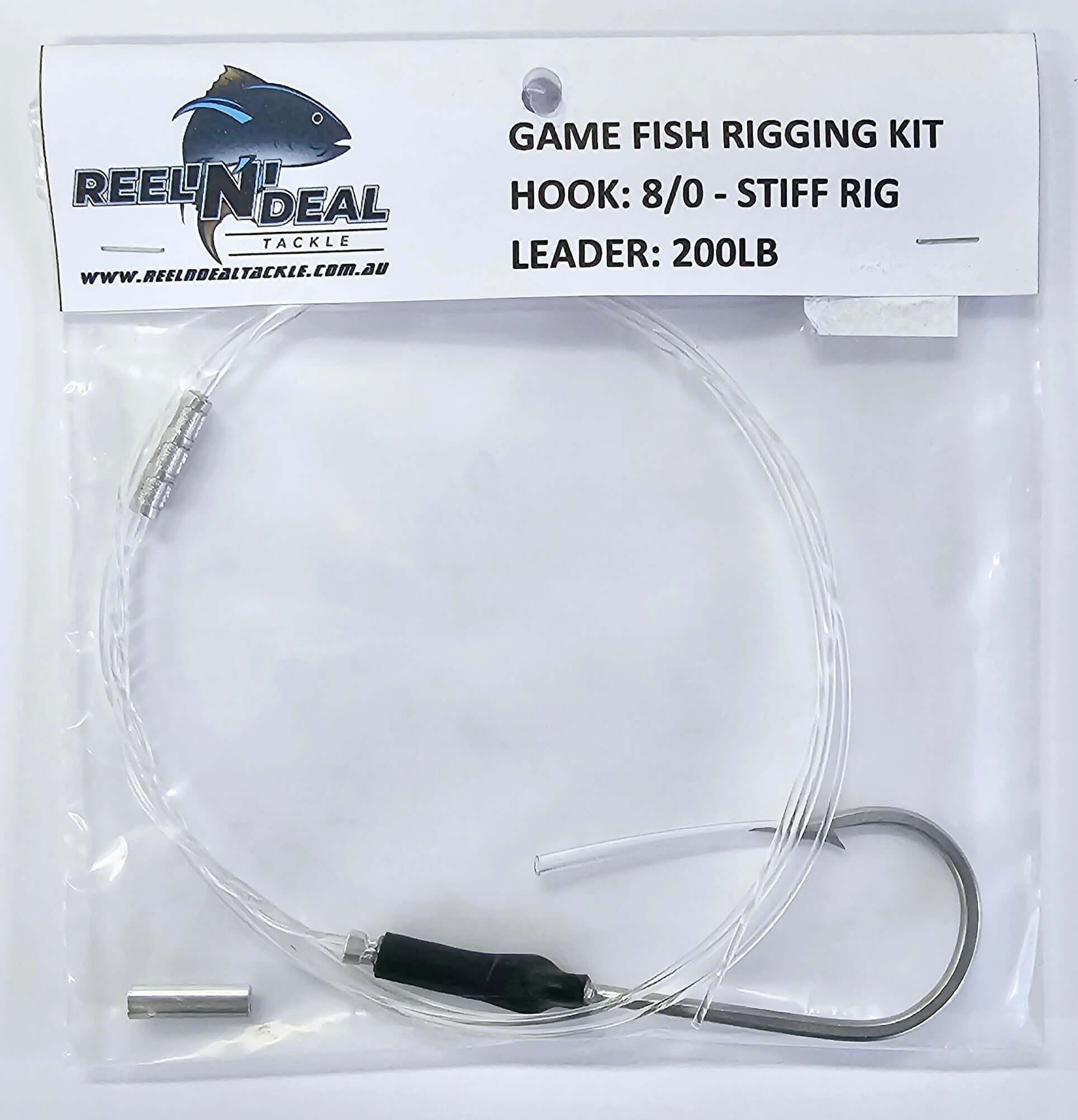 Designed for rigging large size tuna skirts, these stiff rigging kits feature a quality Japanese 8/0 Stainless hook, 200lb Leader, crimps, bead and chafe tube.